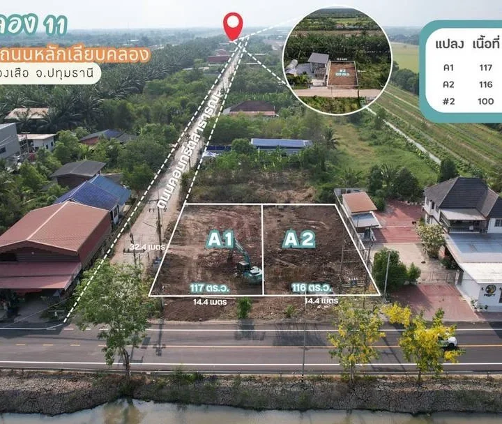 แปลง A2 ขนาดเนื้อที่ 116 ตารางวา หน้ากว้าง 14.4 เมตร ลึก 32.4 เมตร ราคา 14,500 บาท/ตารางวา หรือ 1,682,000 บาท